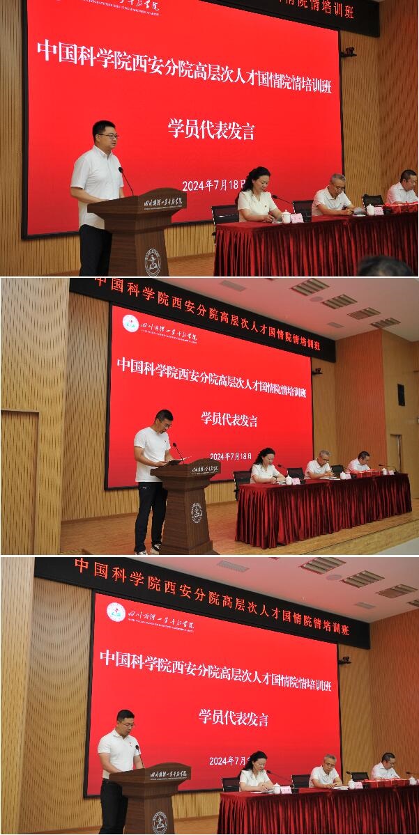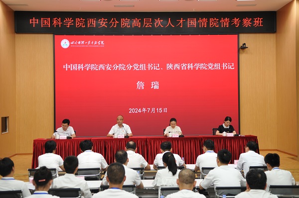 开班仪式上,西安分院分党组书记詹瑞为培训班授班旗,并在讲话中指出,组织中青年科技骨干开展国情院情教育是中国科学院的优良传统,是培养科技人才家国情怀和创新精神的有效载体,也是促进科技人才跨单位、跨学科交流的一个重要途径。当前,我国已进入全面建设社会主义现代化国家、向第二个百年奋斗目标进军的新征程,实现高质量发展目标,就是要全面准确贯彻落实新发展观,实施创新驱动发展战略,对中国科学院来说就是紧抓抢占科技制高点这个核心任务,年轻科技英才继往开来,接续奋斗不止,做出新的历史性科技创新贡献。詹瑞向全体学员提出三点要求:一是紧抓学习机会,努力提升自身素养。二是要坚持目标导向,力求学有所悟;三是要坚持问题导向,力求学有所用。